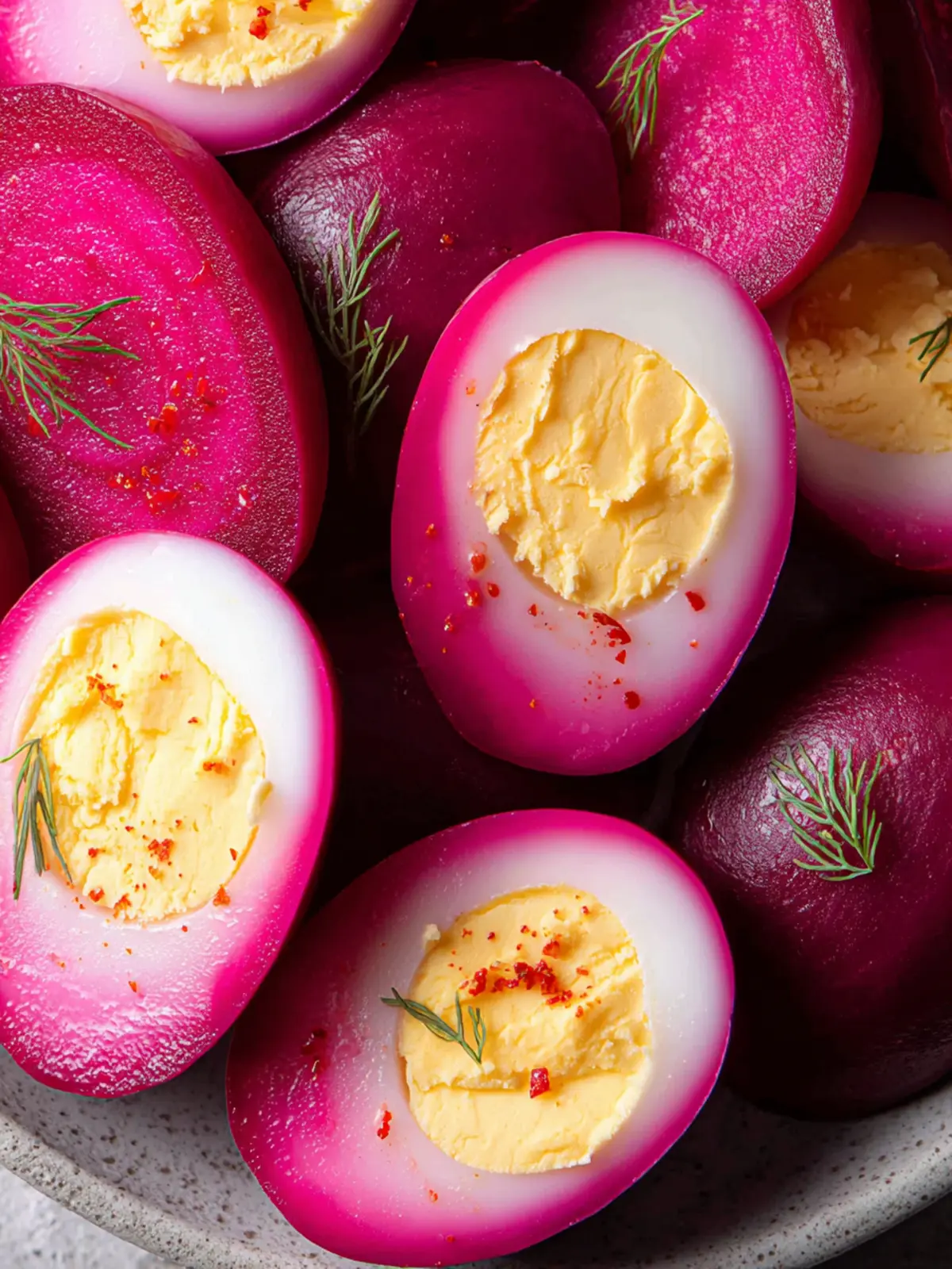 Deliciously tangy pickled eggs infused with the vibrant color and flavor of beets.