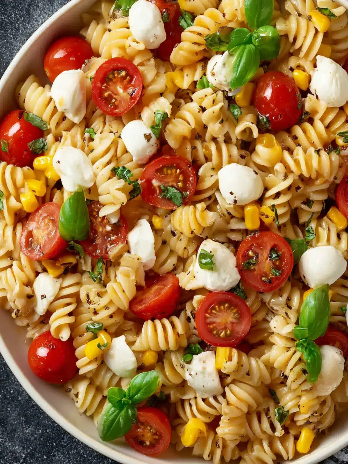 - In a large bowl, add cooked pasta, cherry tomatoes, mozzarella pearls, fresh basil, green onions, and corn. Then pour dressing over the top and toss until coated.