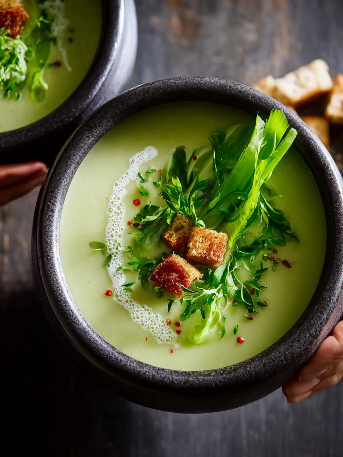 A creamy and vibrant soup made with celery, potatoes, and fresh herbs. Perfect for a comforting meal!