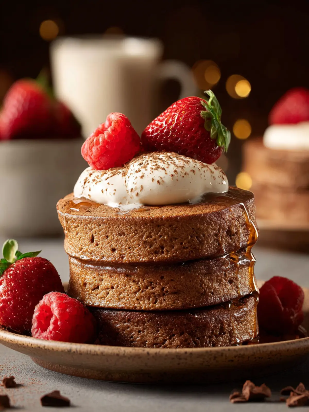 7. Serve the chocolate souffle pancakes warm with a dollop of eggnog whipped cream, fresh berries, and maple syrup.