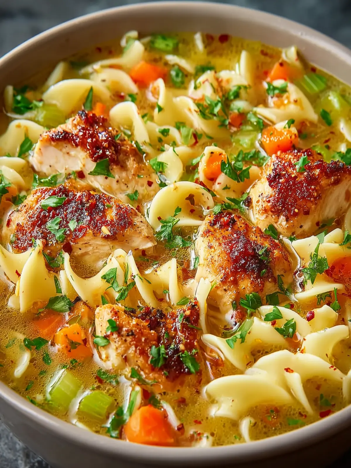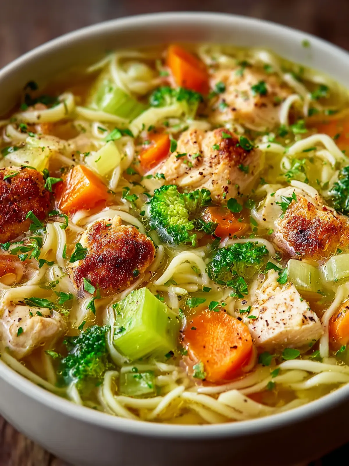 A comforting chicken noodle soup made with tender chicken, fresh vegetables, and egg noodles.