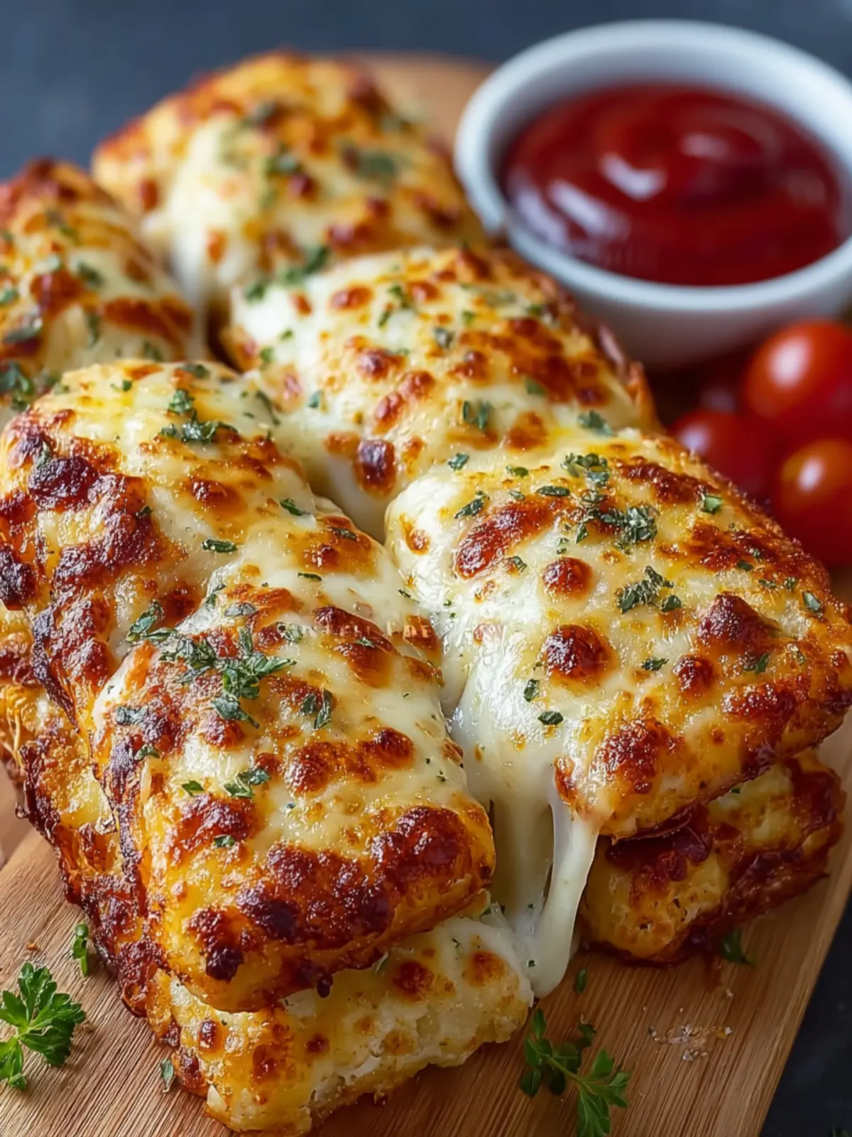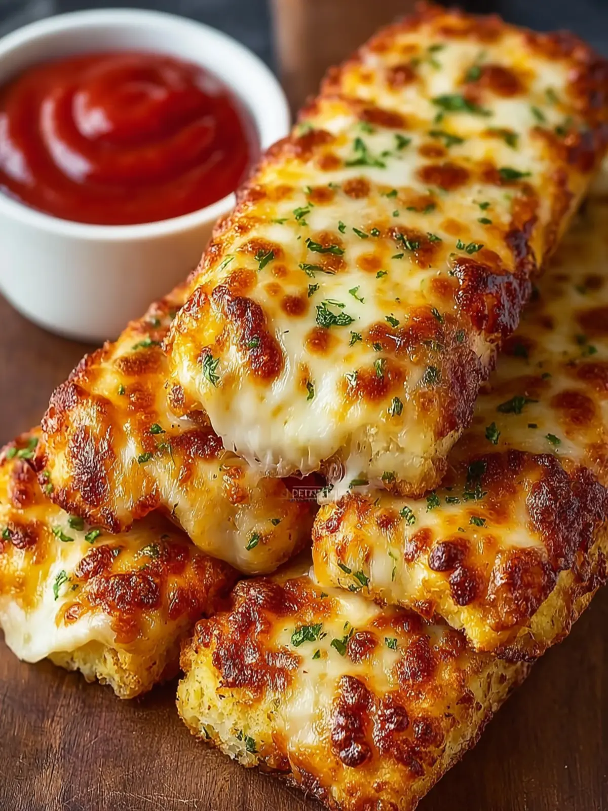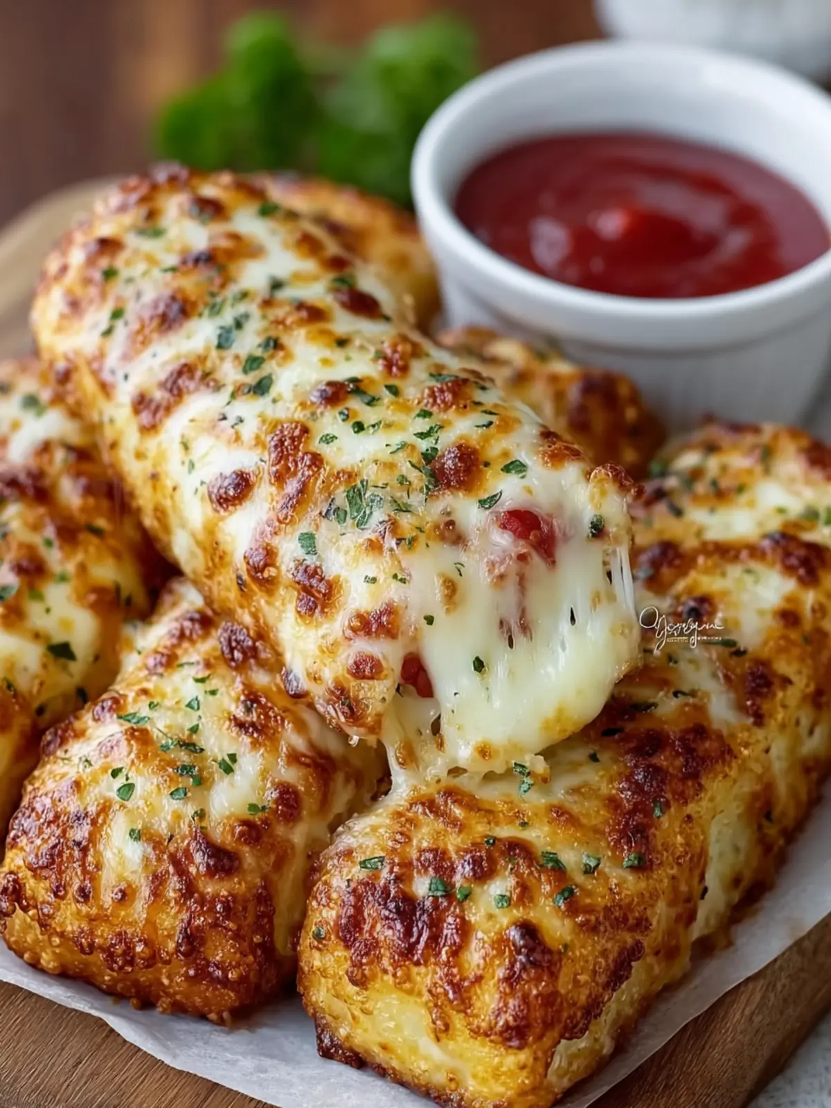 Delicious cheesy garlic breadsticks perfect for dipping in marinara sauce.