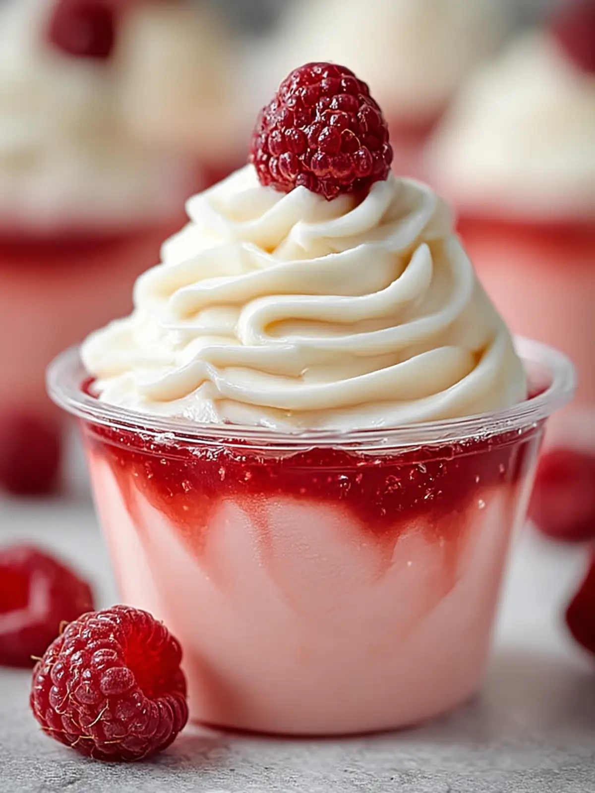- Assemble the Jello Cups: Once the Jello has set, pipe or spoon the creamy topping generously onto each cup of Jello. Garnish with fresh raspberries on top for decoration.