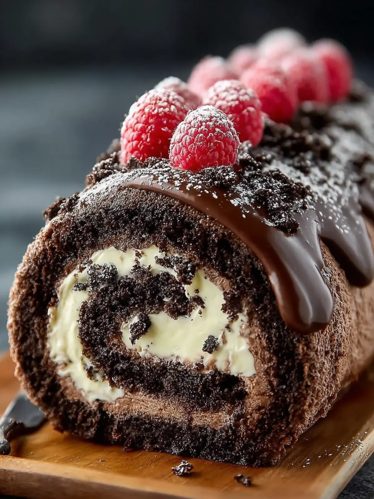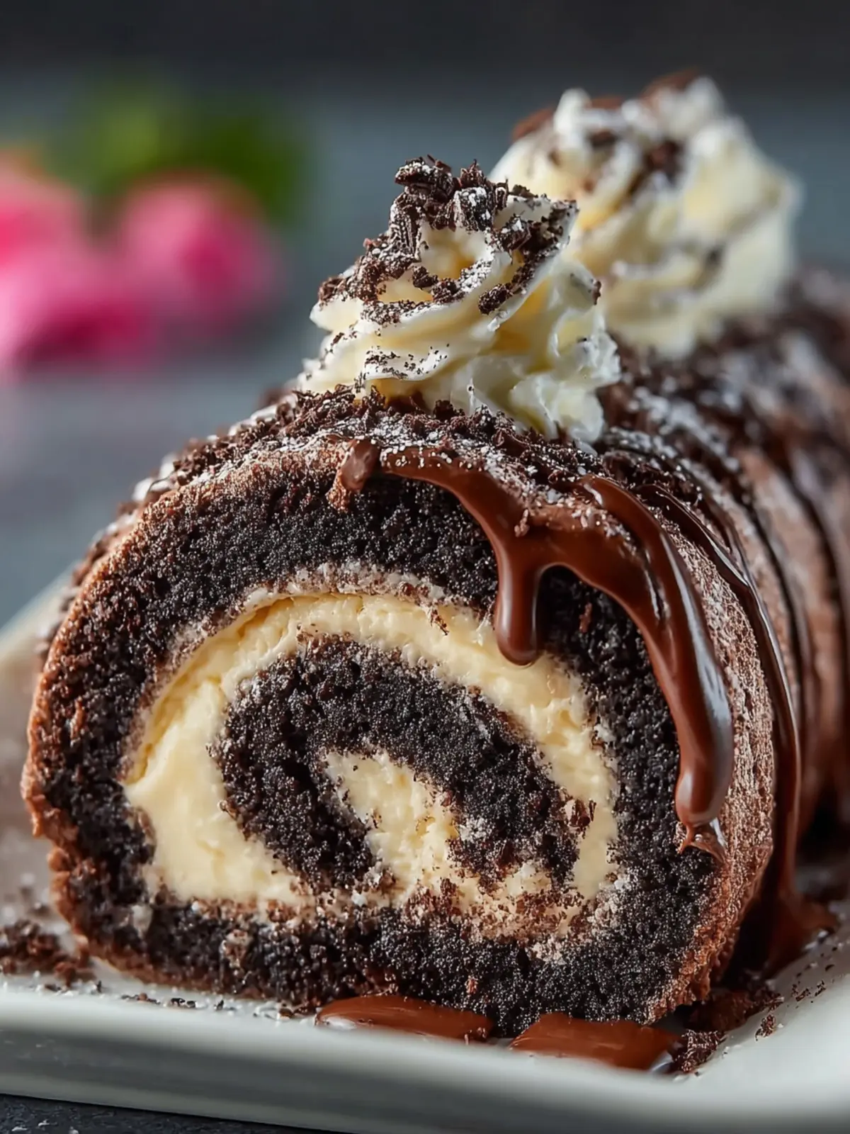 A rich and delicious chocolate roll cake filled with whipped cream and topped with chocolate ganache.