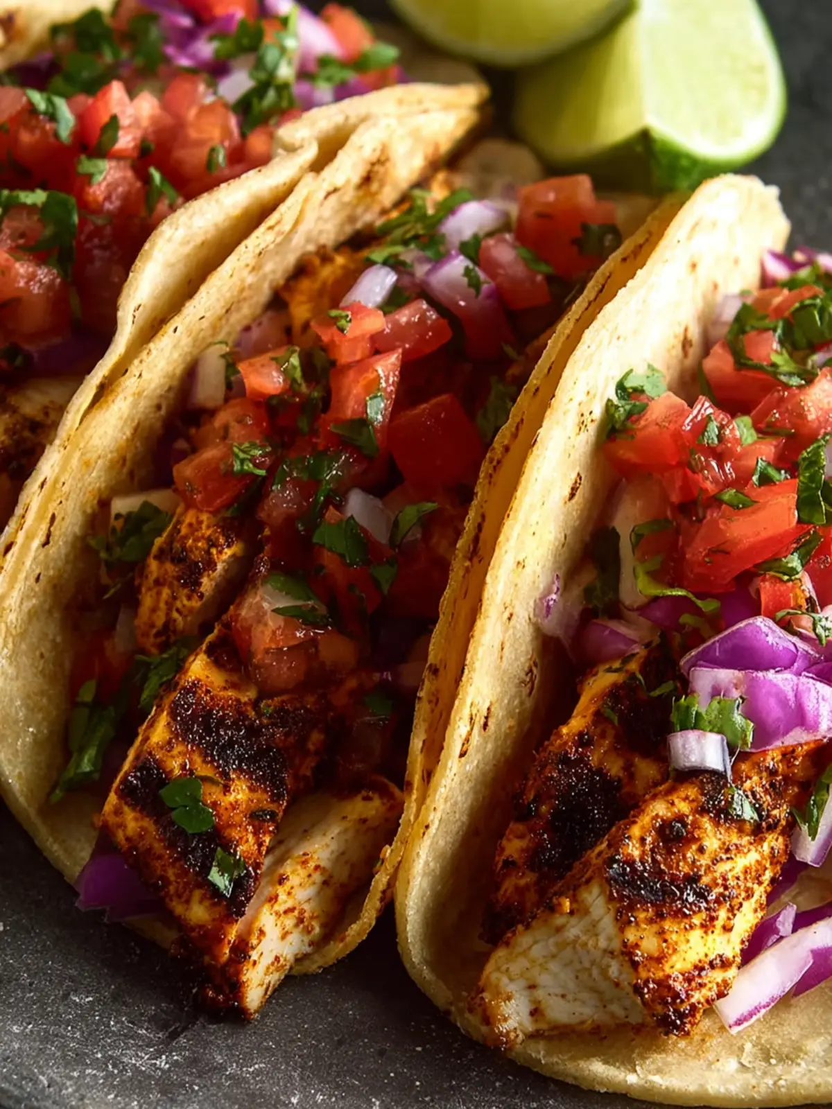 Delicious grilled chicken tacos topped with fresh ingredients.