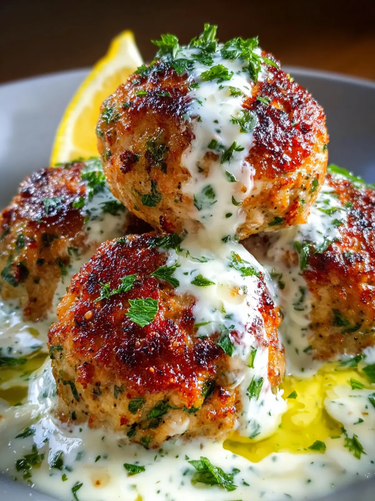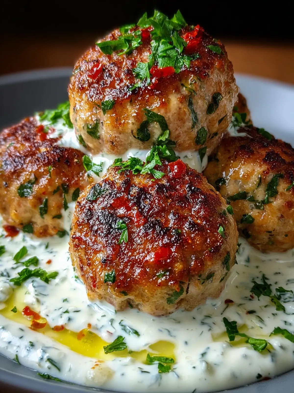 Delicious ground chicken koftas served with a creamy garlic yogurt sauce and fresh herbs.