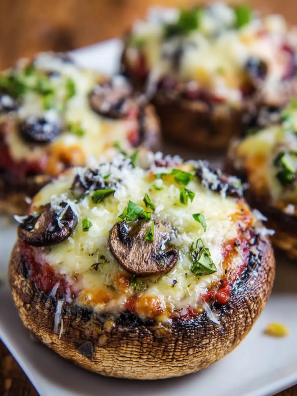 A delicious and healthy alternative to traditional pizza made with large Portobello mushroom caps, topped with pizza sauce, mozzarella cheese, and fresh vegetables.