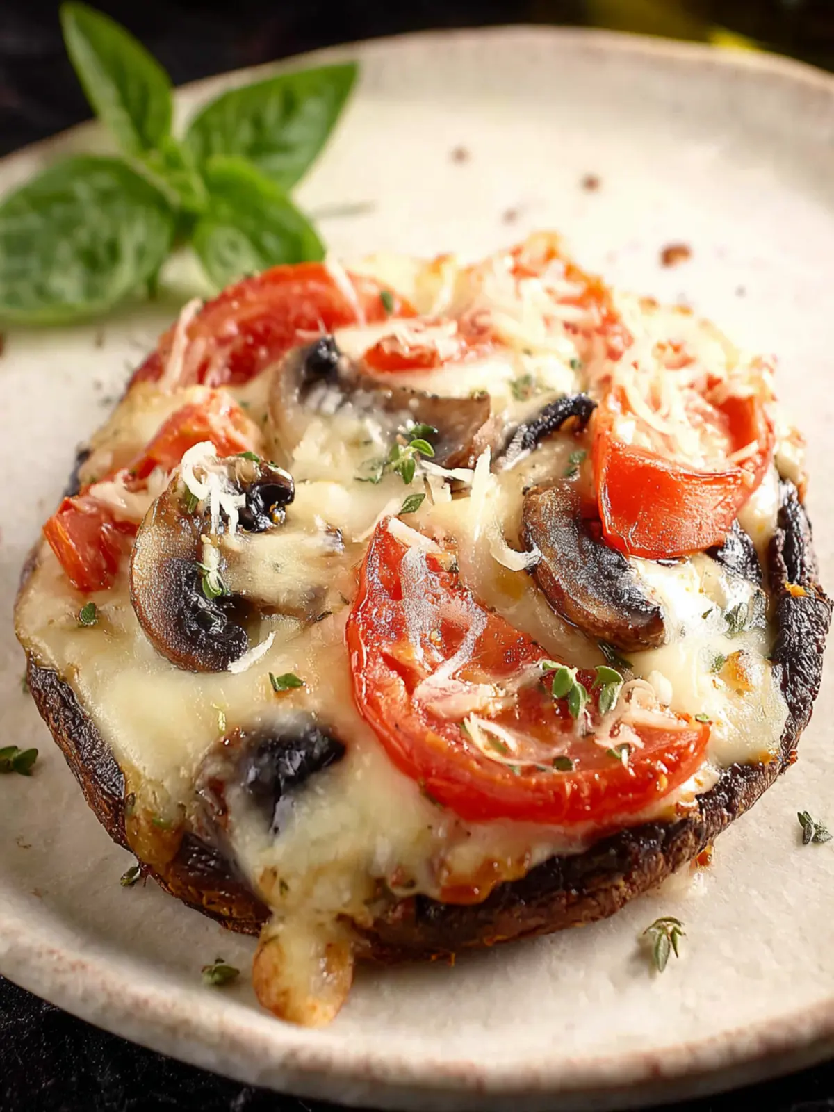 A delicious baked portobello mushroom cap topped with mozzarella cheese, tomatoes, olives, and fresh basil.