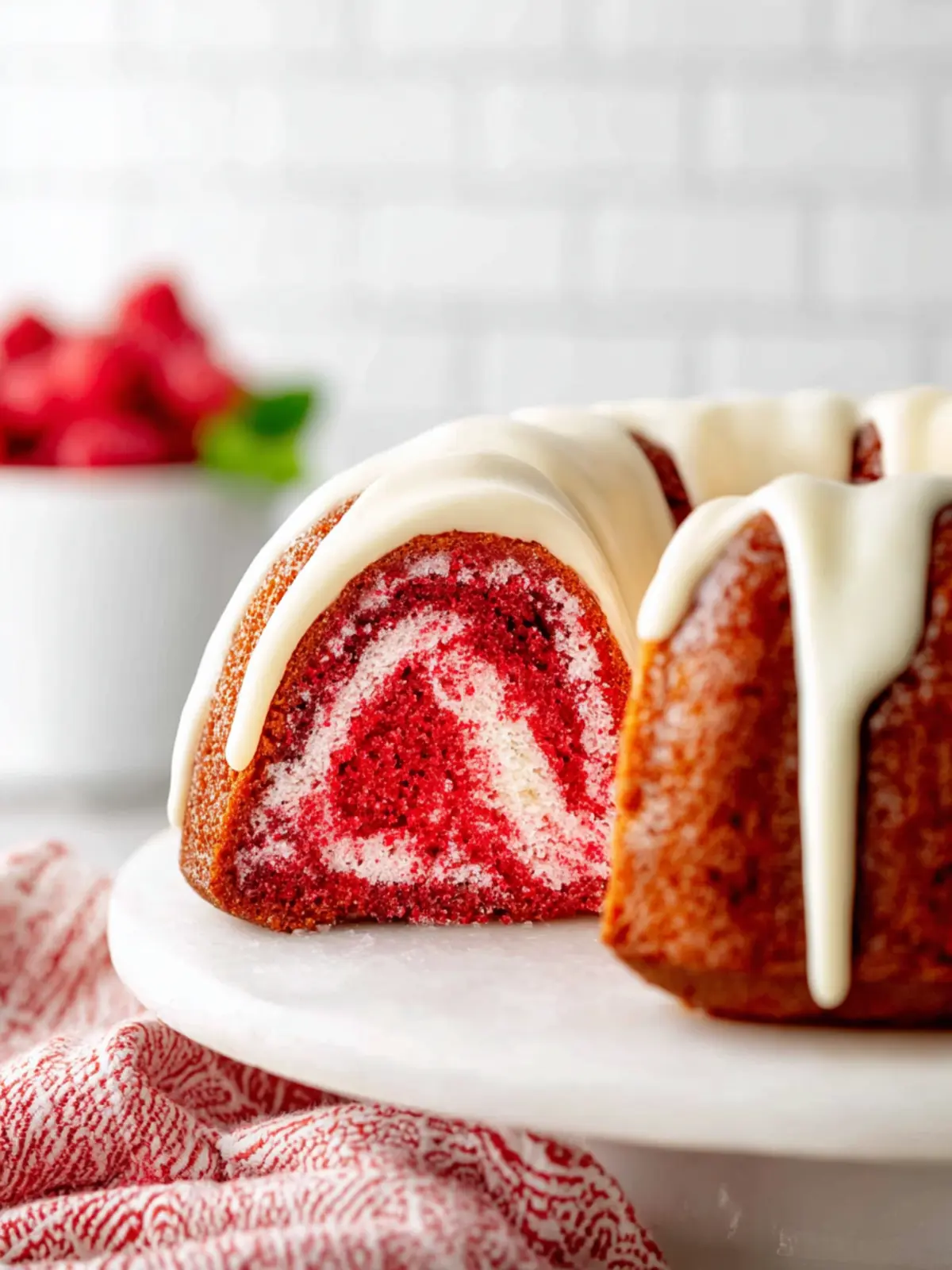 A moist and fluffy red velvet Bundt cake topped with a smooth cream cheese frosting, perfect for any occasion!