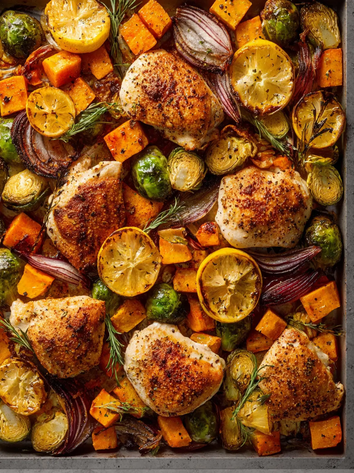 A delicious blend of Brussels sprouts, butternut squash, and chicken thighs, roasted to perfection with garlic, spices, and a hint of lemon.